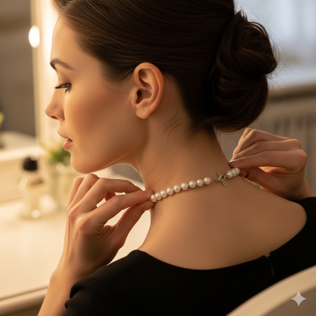 💡 Tipp: Ziehe deinen Perlenschmuck immer als Letztes an – nach Make-up, Parfum und Styling. So vermeidest du, dass die empfindliche Oberfläche beschädigt wird.
