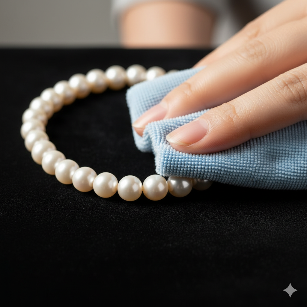 Perlen lieben Hautkontakt! Die natürliche Feuchtigkeit deiner Haut hält sie sogar glänzend. Aber: Parfum, Haarspray oder Cremes sind nicht ihre besten Freunde.